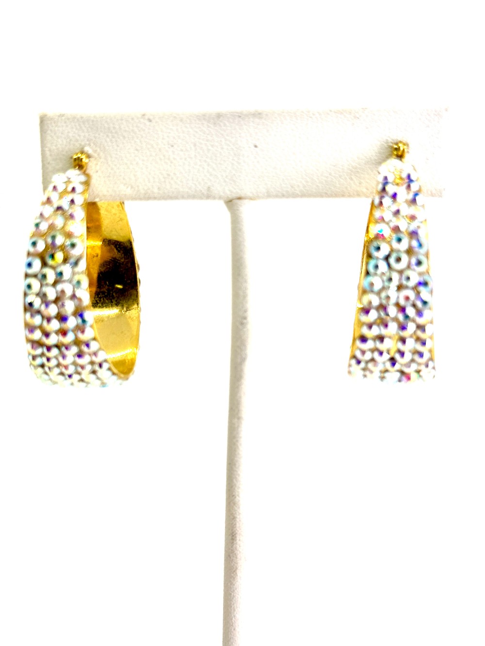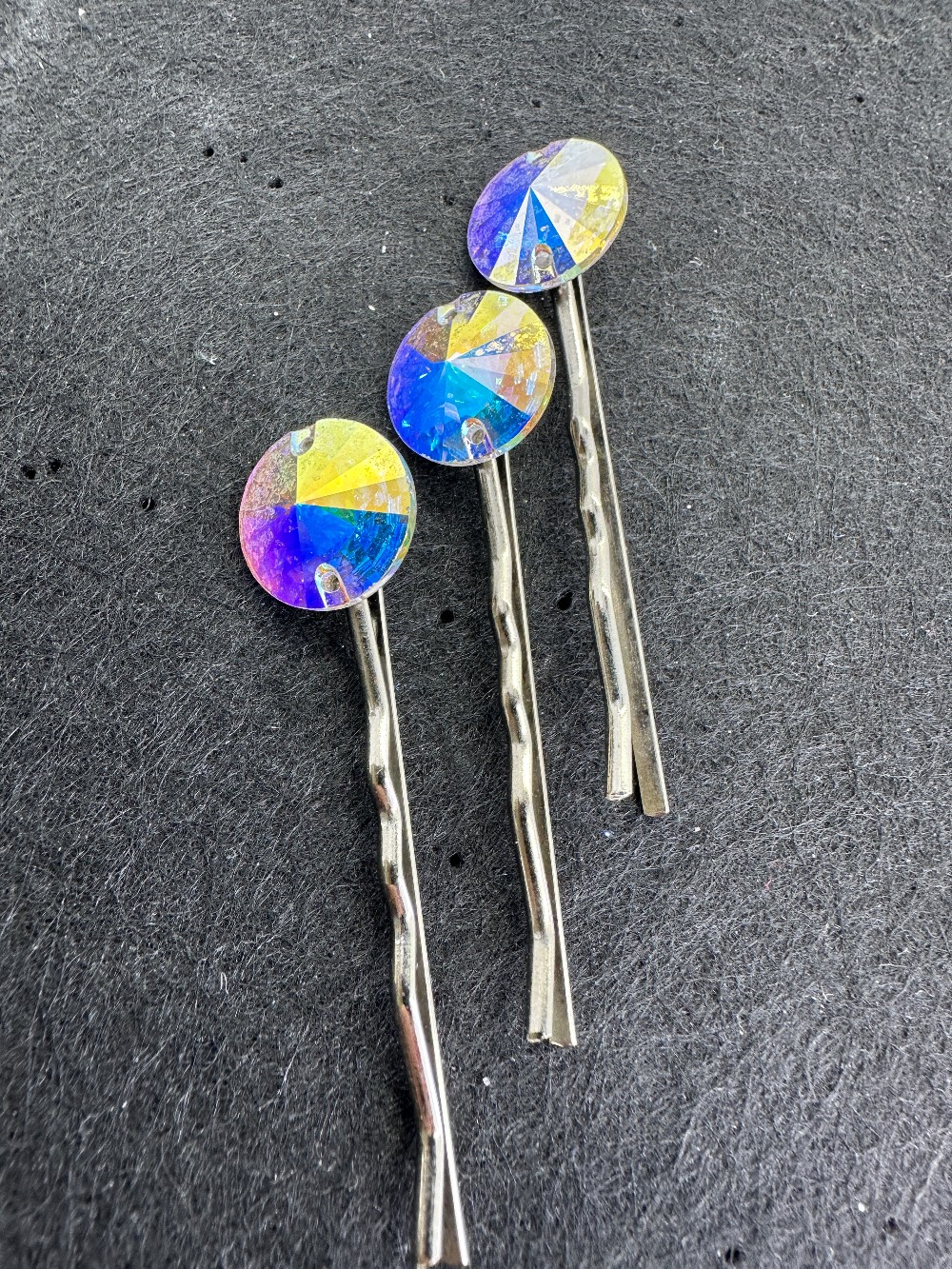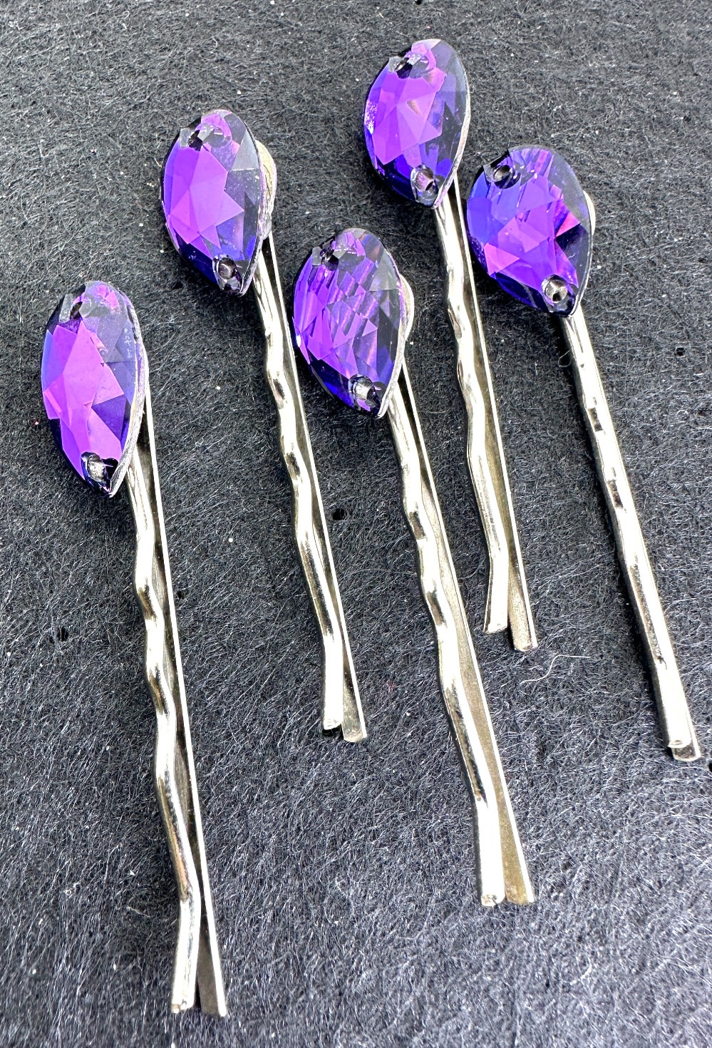 A pair of crystal hair barrettes. Each barrette is adorned with 5 smaller flowers