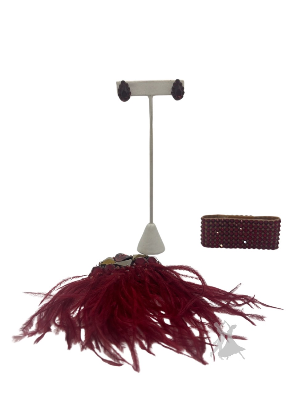 Black rhythm dress with Siam, Jet, Arum, and Labrador Crystals all over bodice with the neckline trimmed in large crystals, in cross hatch pattern on mesh neckline. Shoulders, and back also stoned. Skirt is full and split into panels that flare out in spins and are covered with fun dark red feathers! Comes with matching feather hair piece, earrings and a dark siam crystal wrap bracelet. Very unique and stunning dress!