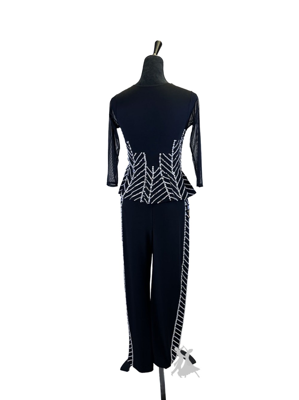 A west coast fantasy pants suit of a rich adorned with pearls on and AB Swarovski Crystals on the top and down the sides of the pants. The top has a built in D/DD bra has a body suit with a peplum that goes over the pants.