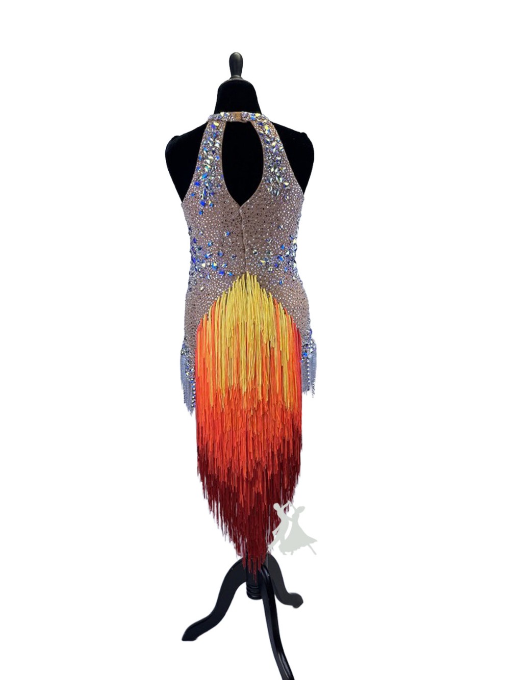 This dress is on fire! Gorgeous stoning on the sides and fire red, orange and yellow fringe down the front.