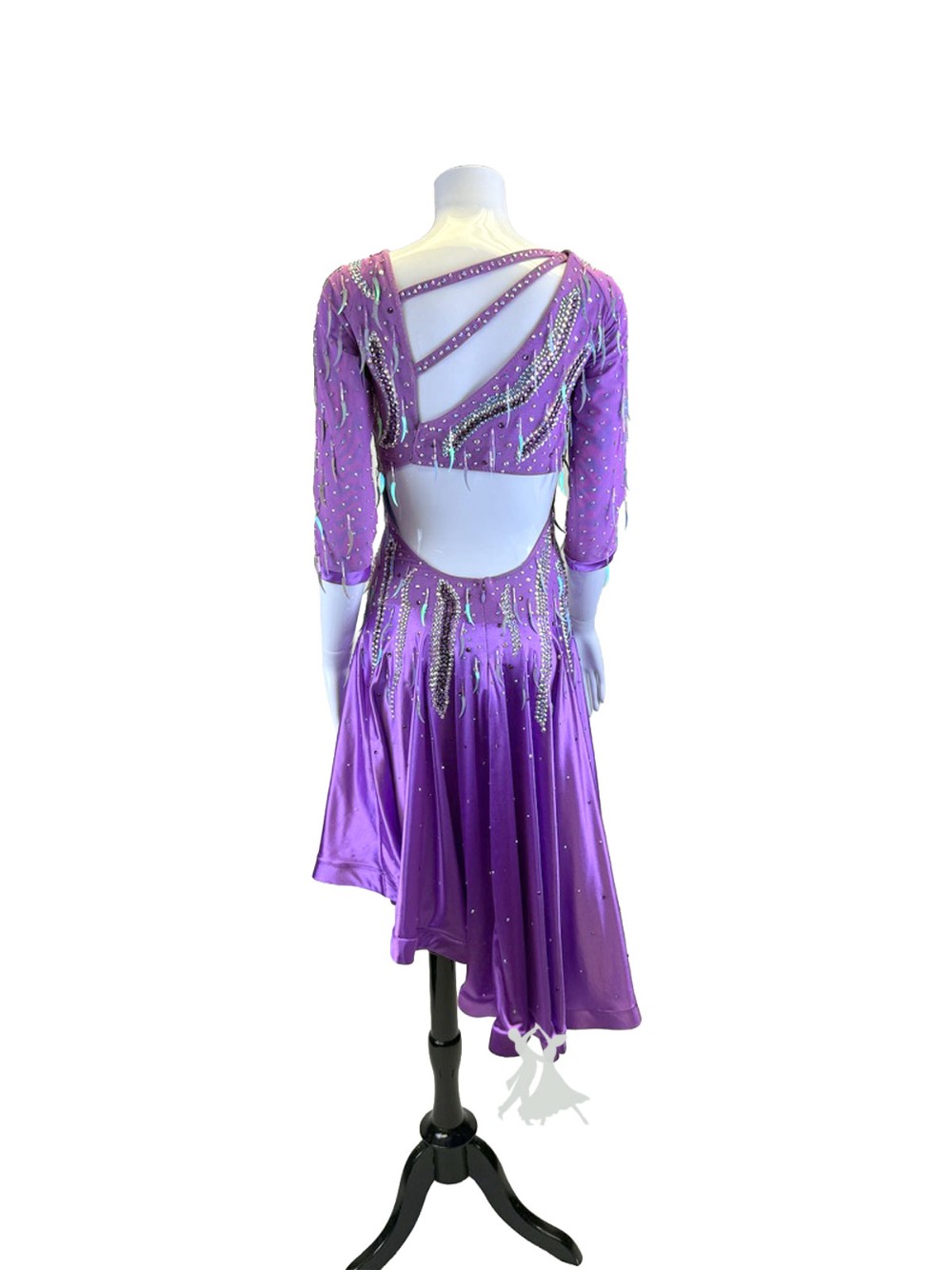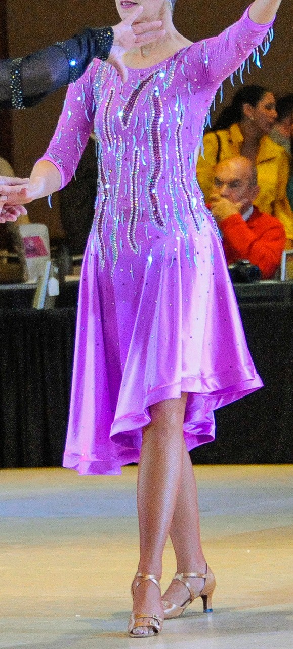 Latin rhythm dress in lush fuchsia satin with diagonal hem, flame stone pattern, paisley shape pailettes sewn on.